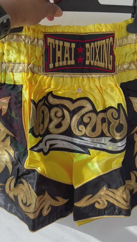 Featuring a bold yellow and black color scheme with a hint of gold, these shorts are designed to make a statement. The vibrant colors and intricate patterns reflect the rich cultural heritage of Muay Thai while adding a modern twist that appeals to contemporary fighters. The combination of colors not only enhances your visibility in the ring but also symbolizes power, determination, and victory.